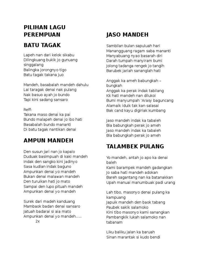 Am den tahankan hati di dalam Am Dm sungguah padiah tak batampakkan G C jo rila mandeh sarato tangih Dm E malapeh. Am G F E Am G F E Dm G C Am Dm E Am. Mandeh Pai Ayah Bajalan Risau lah kami nan baduo Lah badarai badarai juo Hilang ndak dapek diurai mak oi Yo lah malang Alun sabulan si bungsu lahia Mande bajalan tinggakan kami Tinggalah kami manangguang baban Tiado tampek kami ka batenggang Bulan manangih hari maratok Tahun ko bana tuhan bakandak Ayah nan tido kaba barito Jalanglah mandeh yah ka pusaro Ayah baitu bana Dandam ka mandeh.